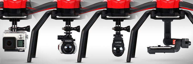 Die mitgelieferte feste Halterung und der 2-Achsen-Gimbal (Aton Plus) nehmen problemlos GoPro's Hero Kameras. Der 2-Achsen-Gimbal akzeptiert insbesondere die GoPro Hero [3, 3+, oder 4] Kamera. Befestigen Sie die Kamera mit einer Rändelschraube an der festen Halterung. Stellen Sie den Winkel der Kamera ein und ziehen Sie die Schraube fest. Für den 2-Achsen-Gimbal sichern Sie Ihre Kamera mit dem Niederhalter.