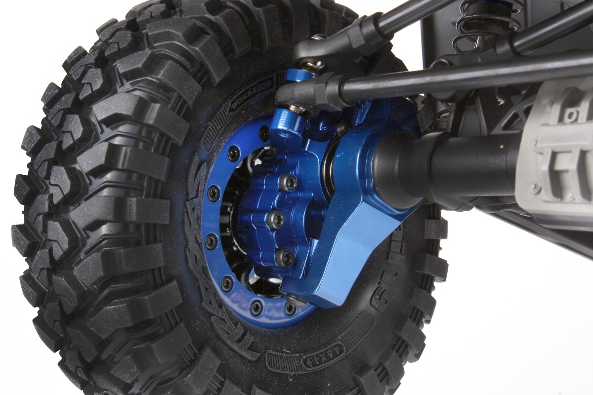 Detail Hinterradnabe Ich liebe es. Die passenden Beadlock-Ringe sehen fantastisch aus, und das Blau hebt sich gut von der schwarzen Hardware ab. Dieses Fahrzeug sieht aus, als wäre es bereit für die SEMA-Show. Die Adventure Karosserie war eine großartige Wahl, und der niedrige Winkel lässt uns einen Blick auf die eloxierten Teile werfen. Der Kontrast zwischen Orange und Blau ist wirklich beeindruckend. Die LED-Leuchten sind wirklich hell. Sie geben wirklich einige Lumen ab - sowohl vor dem Truck als auch unter ihm, dank der in den Radkästen versteckten LEDs.