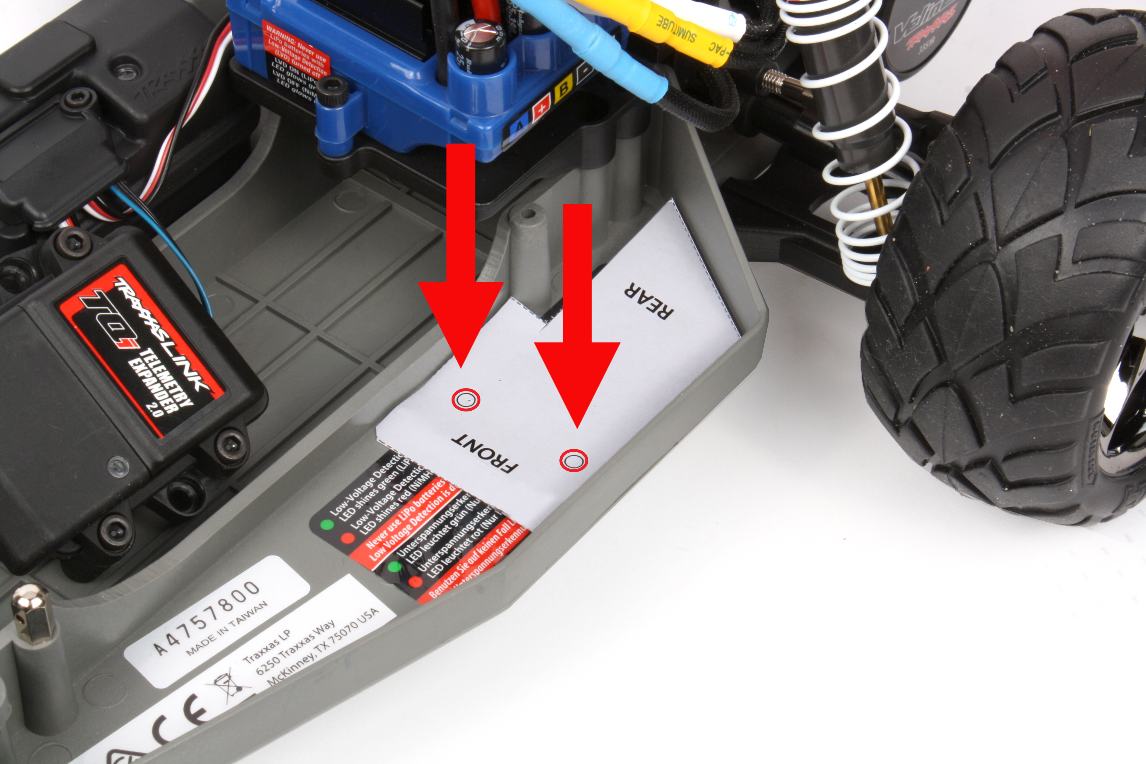 Telemetrie-Expander-Halterung Der Expander wird mit Schrauben am Chassis befestigt, und zwar über die #6554 Adapter. Das größere Teil auf der linken Seite ist für den Slash 2WD; für den Bandit und Rustler benötigen Sie nur das rechteckige Teil. Sie müssen zwei Löcher für den Expander mit dem mitgelieferten Bit bohren. Dann wird die Ablage mit dem Chassis verschraubt, und der Expander wird mit der Ablage verschraubt.