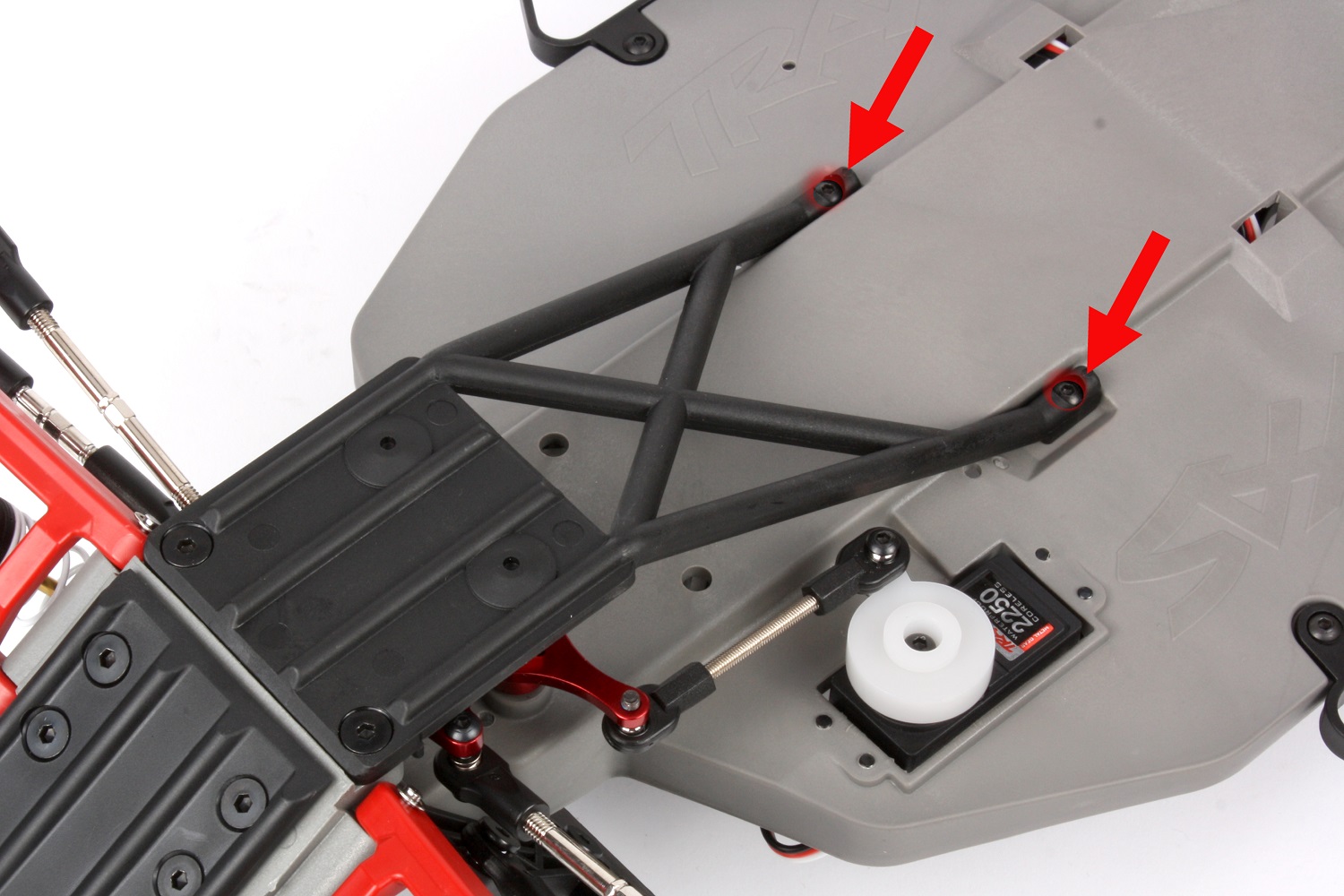 Nun werden wir die Elektronik vom Originalchassis entfernen. Entfernen Sie die gezeigten Schrauben von der Empfängerbox, dem Fahrregler und dem Servo. Die Schrauben, die die Empfängerbox sichern, sind zugänglich, wenn der Deckel entfernt ist. Entfernen Sie den Servo-Saver vom Servo, indem Sie die gepfeilte Schraube herausnehmen und am Servo-Saver ziehen. Wenn der Servo-Saver entfernt ist, kann das Servo aus dem Gehäuse genommen werden. Ziehen Sie den Fahrtenregler und das Servo vom Empfänger ab und legen Sie die Elektronik beiseite.