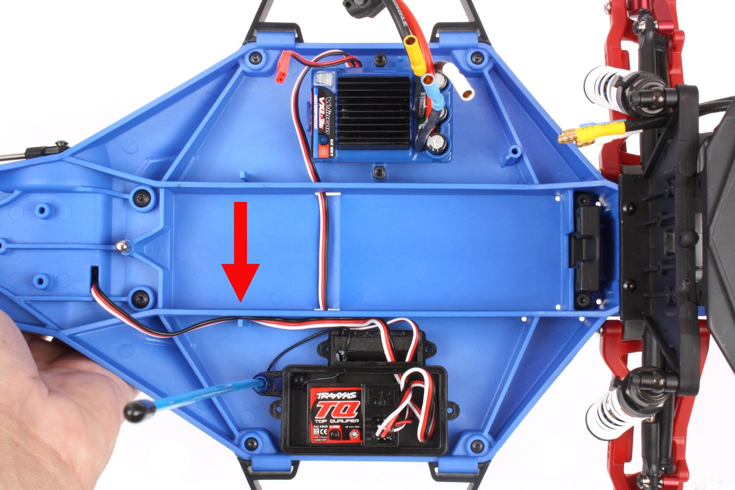 Montieren Sie die Empfängerbox und den Fahrtregler mit den in Schritt 8 entfernten Teilen wieder. Verwenden Sie die in das Chassis eingegossene Drahtklammer, um das Servokabel entlang des Batteriekanals zu halten, und führen Sie das Fahrpedalkabel durch die Schlitze in den Wänden des Batteriekanals. Wenn Sie einen VXL-3s Fahrtregler haben, verwenden Sie dessen integrierte Klemme, um das Kabel zu halten. Denken Sie daran, das Lenkservo in Kanal 1 und den Fahrtregler in Kanal 2 einzustecken. Bringen Sie den Deckel der Empfängerbox wieder an und vergewissern Sie sich, dass die blaue O-Ring-Dichtung an ihrem Platz ist.